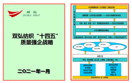 A qualidade é a vida de uma empresa. Como sênior da empresa, o camarada Ji Yijun sempre considerou a melhoria da qualidade como a principal prioridade da empresa por mais de 40 anos. Sob seu navio e influência, a Double Great Company introduziu e implementou o Modelo de Gerenciamento de Excelência em Desempenho desde 2007, formando a missão de "Todo fio é o valor do sol", os principais valores de "inovação, qualidade, integridade e harmonia" e a visão da "Longevidade da vida, Evergreen Double Great". The refined quality management slogan "No matter how small the quality is, it is a big deal, no matter how difficult the quality is, it must be done well, and employees who do not pay attention to quality are not good employees" has been incorporated into the company's quality aphorisms, and the quality work motto "Quality will have a market" has become a quality concept known to everyone in the company, and has been promoted and disseminated to the entire industry through an exclusive interview with China Textile News.