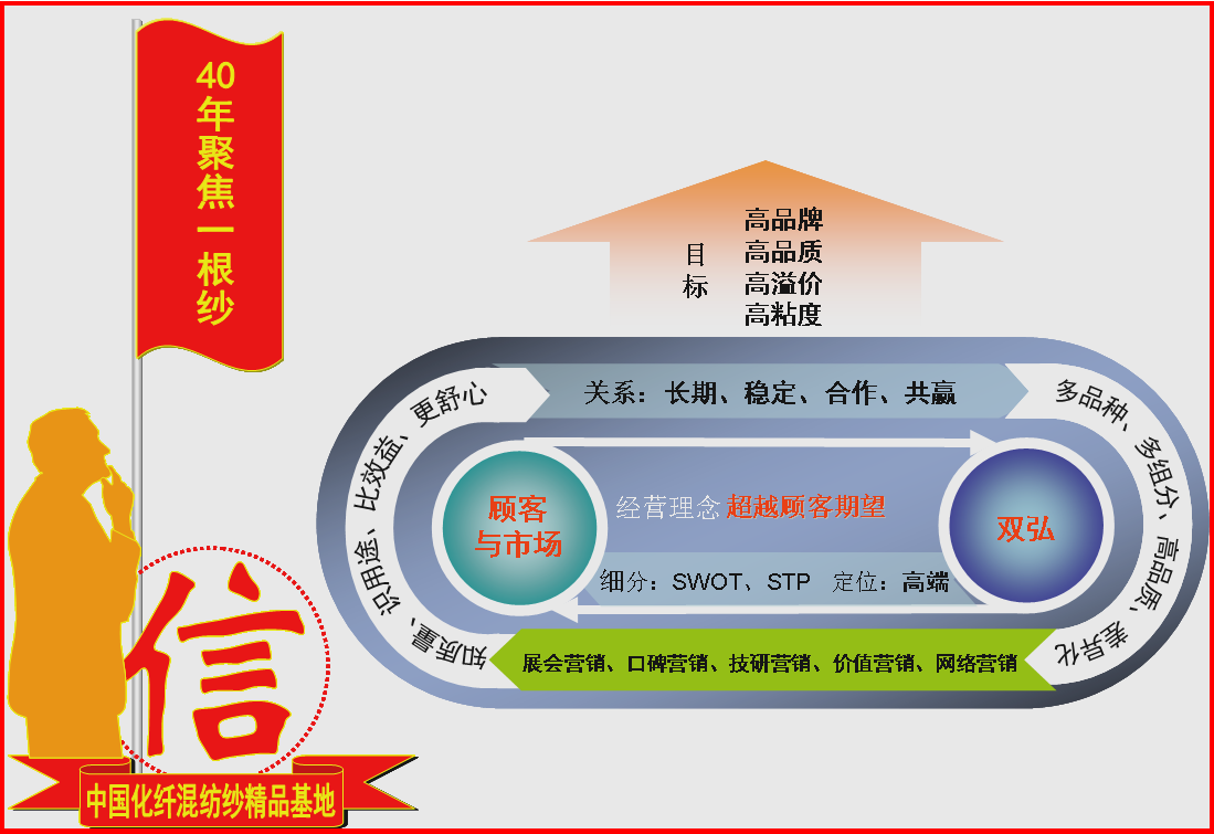 Focando os clientes e a melhoria das marcas são os requisitos resolutos e as atividades firmes do camarada Ji Yijun em seu trabalho. Under his advocacy, the company has formulated the business philosophy of "using the rigorous management, spinning the quality yarn, and climbing the -end customers", with "high brand, high quality, high premium, and high stickiness" as the goal, using "SWOT, STP" and other tools to investigate and segment the market, lock in key customer groups, adopt a "small batch, multiple varieties, fast delivery, high quality" fast marketing strategy, implement "exhibition marketing, word-of-mouth marketing, technical research marketing, knowledge marketing, value marketing, network marketing" and other methods, and use the "30 Articles of Double Great Service Guidelines" to let customers "know the quality, recognize the purpose, compare benefits, fast delivery, and more comfortable", establish a "long-term, stable, cooperative, and win-win" customer relationship, and form a highly competitive Double Great marketing model to win and maintain customer satisfaction and loyalty and achieve the common development of customers and Double Ótimo.