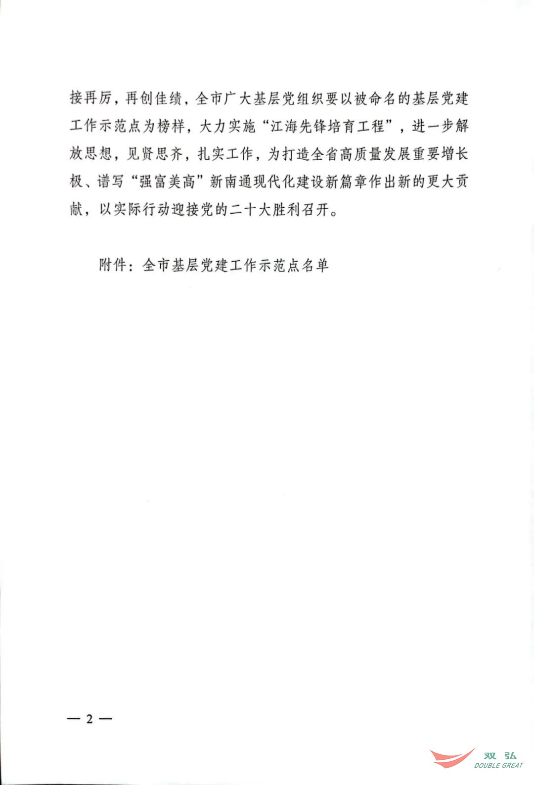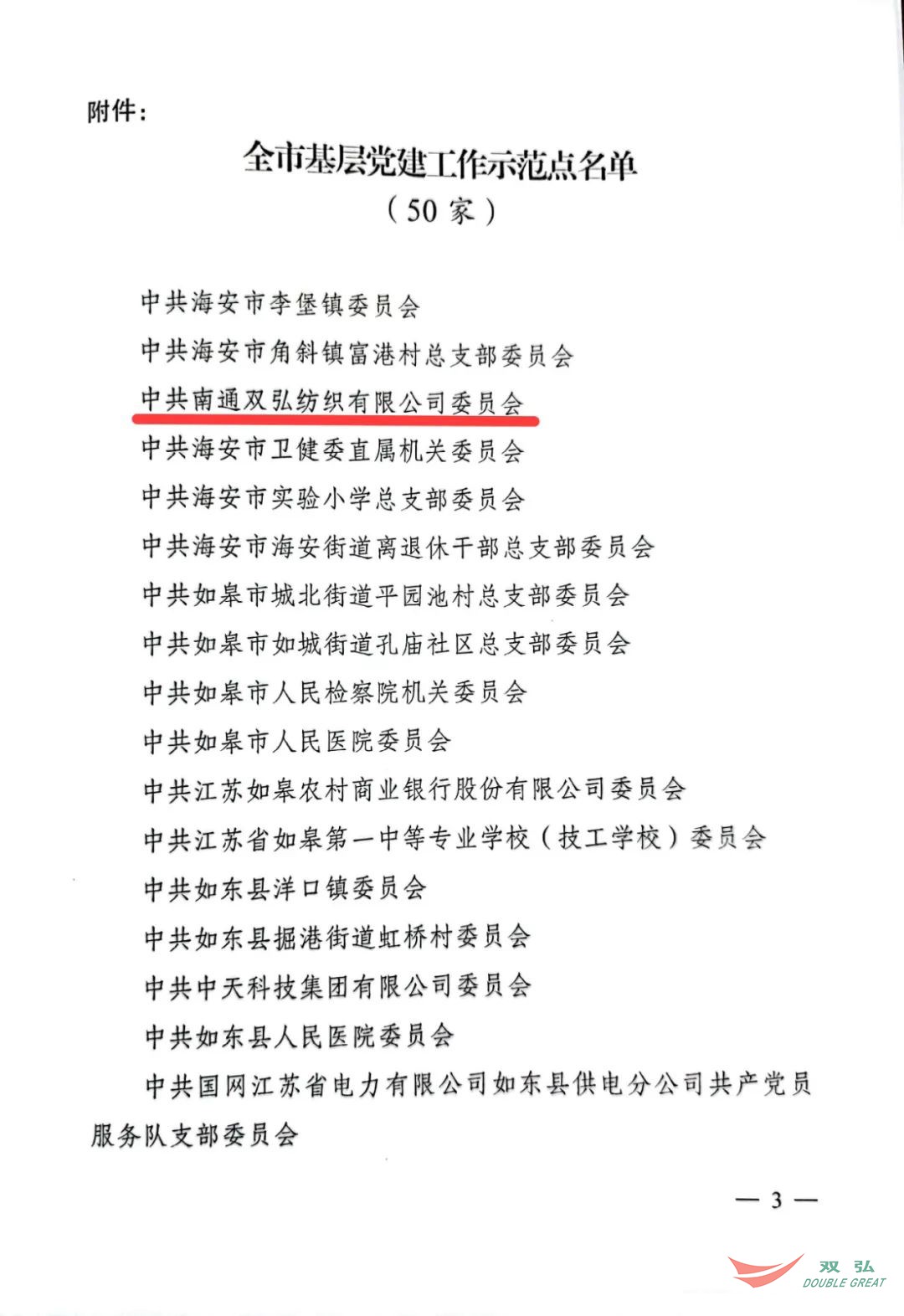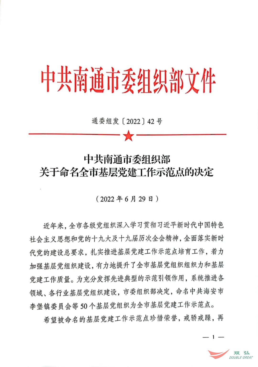 Recentemente, Assim, o Departamento da Organização do Comitê Municipal do CPC em Nantong publicou um documento nomeando 50 organizações partidárias de base como os locais de demonstração de edifícios de base de base da cidade. O Comitê do Partido da Nantong Double Great Textile Co., Ltd. recebeu o título de "Local de demonstração de edifícios de Party Bread Building da cidade".